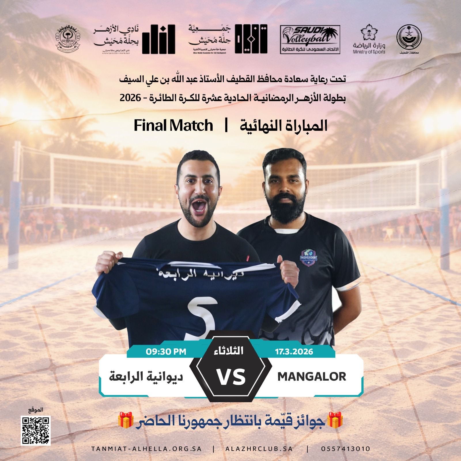 ويجمع النهائي المرتقب بين فريقي ديوانية الرابعة ومانغلور الهندي (Mangalor) في مواجهة قوية يُنتظر أن تحمل الكثير من الإثارة والندية، بعد مشوار تنافسي مميز قدّم خلاله الفريقان مستويات لافتة أهلتهما بجدارة لبلوغ المباراة النهائية.