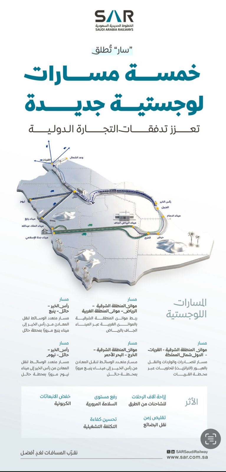 ومن المتوقع أن تسهم هذه المسارات في إزاحة آلاف الرحلات للشاحنات من الطرق، ورفع مستوى السلامة المرورية، وخفض الانبعاثات الكربونية، إلى جانب تقليص زمن نقل البضائع وتحسين الكفاءة التشغيلية، بما يعزز من دور “سار” كممكن وطني رئيسي لمنظومة النقل والخدمات اللوجستية.