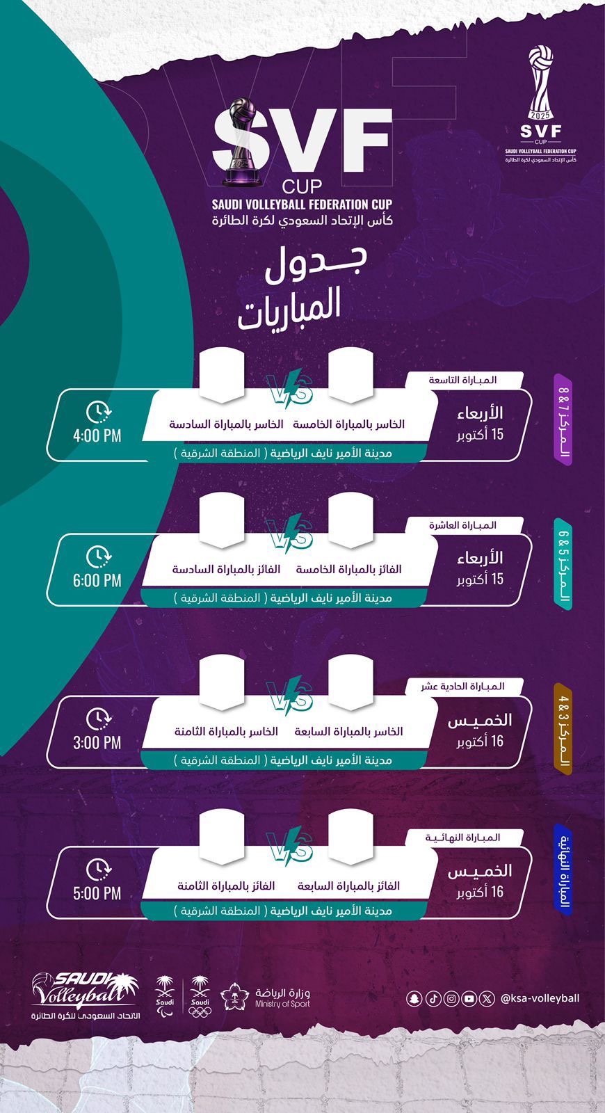 ومن المقرر أن تُقام مباريات دور الثمانية يوم السبت المقبل الموافق 11 اكتوبر على صالة مدينة الأمير نايف الرياضية بالقطيف ويقام النهائي يوم 16 أكتوبر 2025م