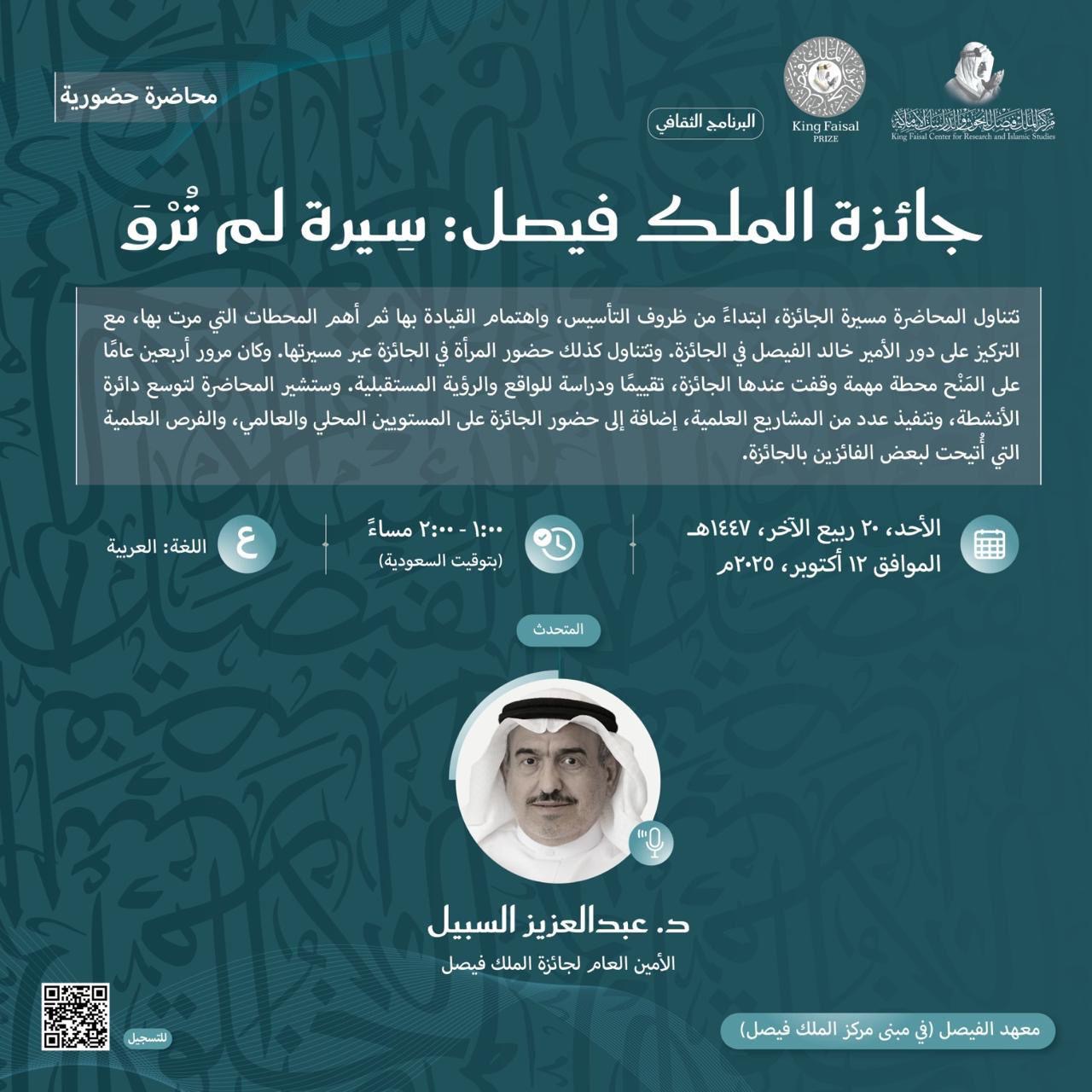 يُنظّم مركز الملك فيصل للبحوث والدراسات الإسلاميةضمن برامج المركز الثقافي، وبالتعاون مع جائزة الملك فيصل، محاضرة حضورية بعنوان”جائزة الملك فيصل: سيرة لم تُرْوَ”، يقدمها سعادة الدكتور عبدالعزيز السبيّل، الأمين العام لجائزة الملك فيصل، وذلك يوم الأحد 12 أكتوبر 2025، في معهد الفيصل بمبنى مركز الملك فيصل للبحوث والدراسات الإسلامية بالرياض، في تمام الساعة الواحدة مساءً.