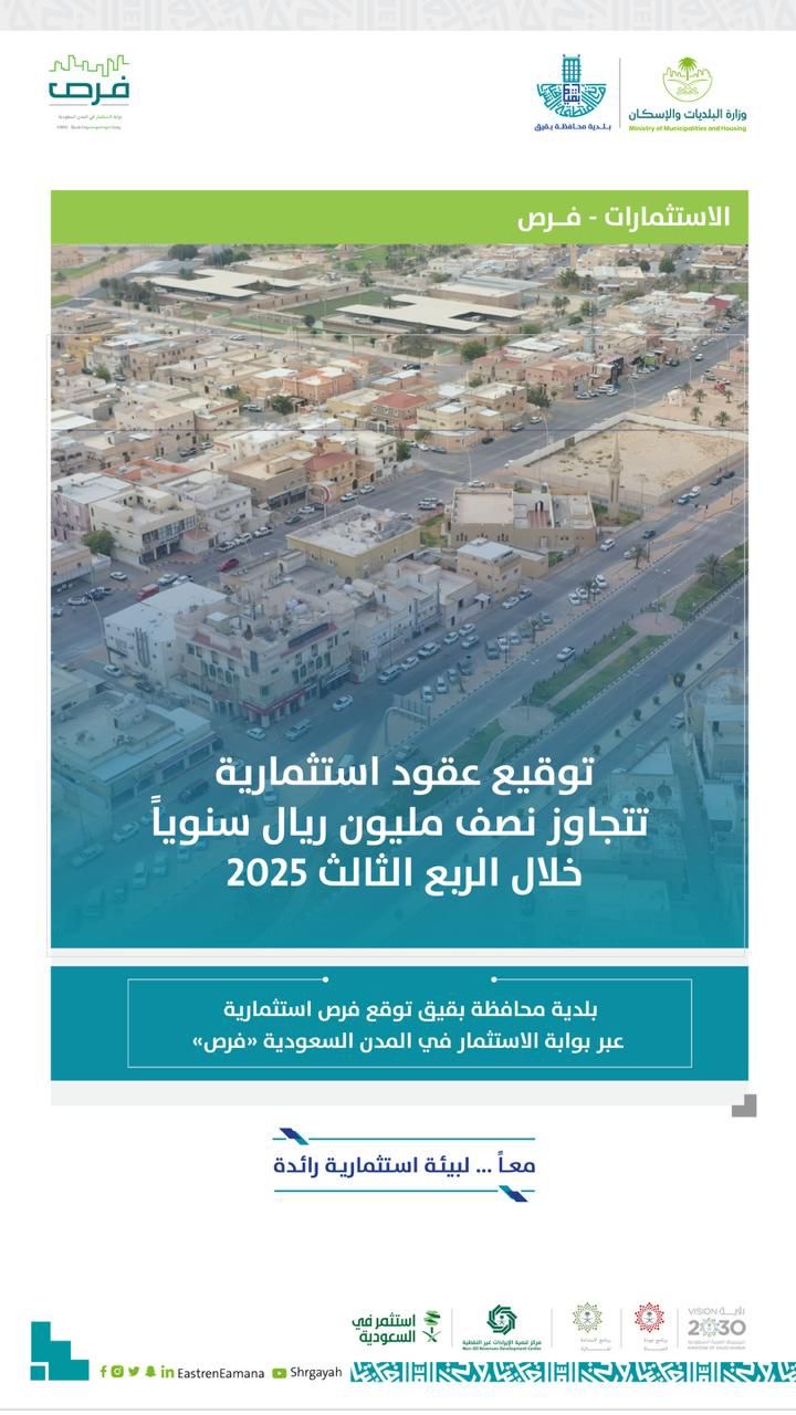 وتأتي هذه الجهود ضمن مستهدفات بلدية محافظة بقيق لتعزيز التنمية الاقتصادية، ورفع كفاءة الاستثمار البلدي، وبما ينسجم مع رؤية السعودية 2030 الهادفة إلى تمكين الاستثمار وتطوير المدن وخلق بيئة حضرية مستدامة تسهم في تحسين جودة الحياة وتعزيز النمو المتوازن بالمحافظات.)