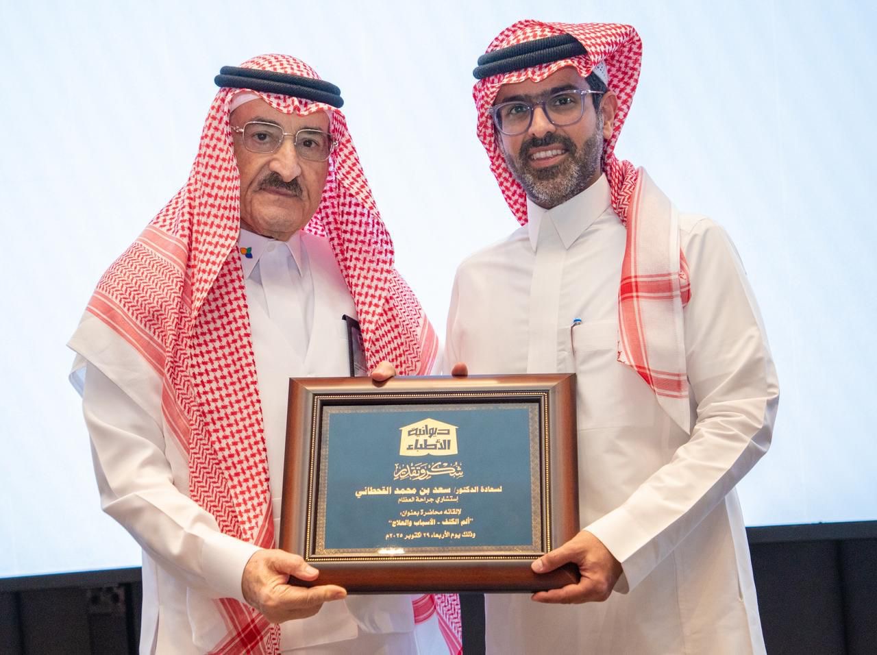 وتناول الدكتور سعد القحطاني، الذي يعمل ايضاً رئيس قسم جراحة العظام بمستشفى الملك فهد الجامعي بالخبر التابع لجامعة الامام عبدالرحمن بن فيصل، الأسباب الرئيسية لألم الكتف ومنها: التهاب أو قطع أوتار الكتف، الكتف المتجمدة “الكتف المتيبس”، التهاب وخشونة المفصل، خلع أو كسر الكتف، إصابات العضلة ذات الرأسين، التهاب مفصل الأخرم والترقوة، ألم مُحال من الرقبة أو القلب، متلازمة الانحشار العظمي، مؤكداً بأن ألم الكتف متنوع الأسباب لكنه قابل للعلاج في معظم الحالات مع ضرورة الكشف المبكر والعلاج المنتظم، وأن العلاج لدى متخصص يسهل ويمنع المضاعفات.