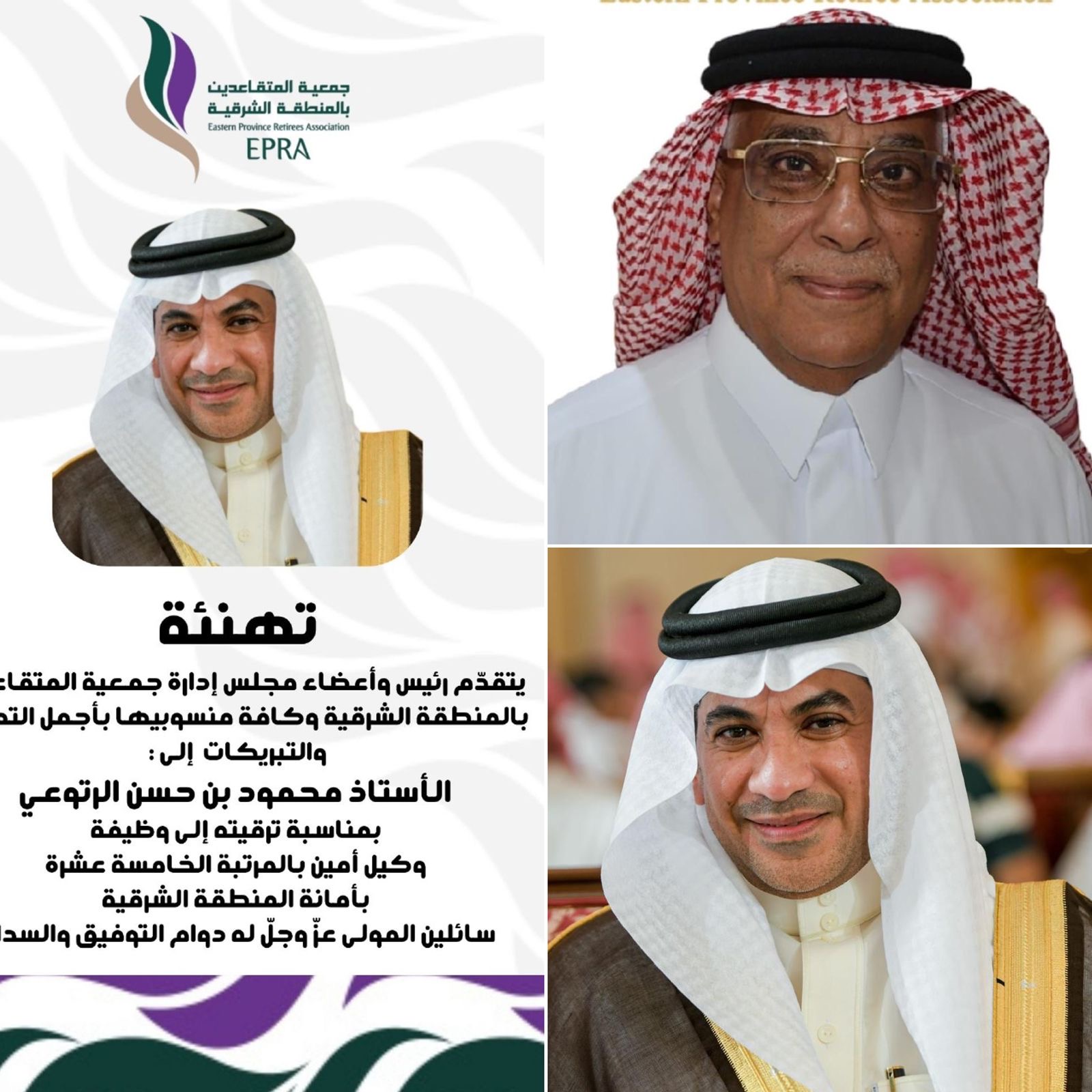 قدم رئيس مجلس إدارة جمعية المتقاعدين بالمنطقة الشرقية الأستاذ محمد القرناس بأسمه ونيابة عن أعضاء وكافة منسوبي الجمعية بأجمل التهاني والتبريكات إلى سعادة الأستاذ محمود بن حسن الرتوعي بمناسبة ترقيته إلى المرتبة الخامسة عشرة بأمانة المنطقة الشرقية سائلين المولى عزّ وجلّ أن تكون هذة الترقية عون له على طاعته ولخدمة الدين ثم الملك والوطن متمنين له دوام التوفيق والسداد في مسيرته العلمية وفي حياته اليومية .