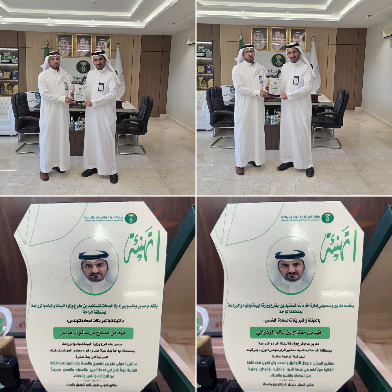 قدم مدير ومنسوبي إدارة خدمات المستفيدين بفرع وزارة البيئة والمياه والزراعة منطقة الباحة الأستاذ علي بن فيصل الزهراني بأسمه ونيابة عن منسوبي الفرع التهنئة والتبريكات لسعادة المهندس فهد بن مفتاح بن سالم الزهراني مدير عام فرع وزارة البيئة المياه والزراعة بمنطقة الباحة بمناسبة صدور قرار مجلس الوزراء بترقيته للمرتبة الرابعة عشرة .