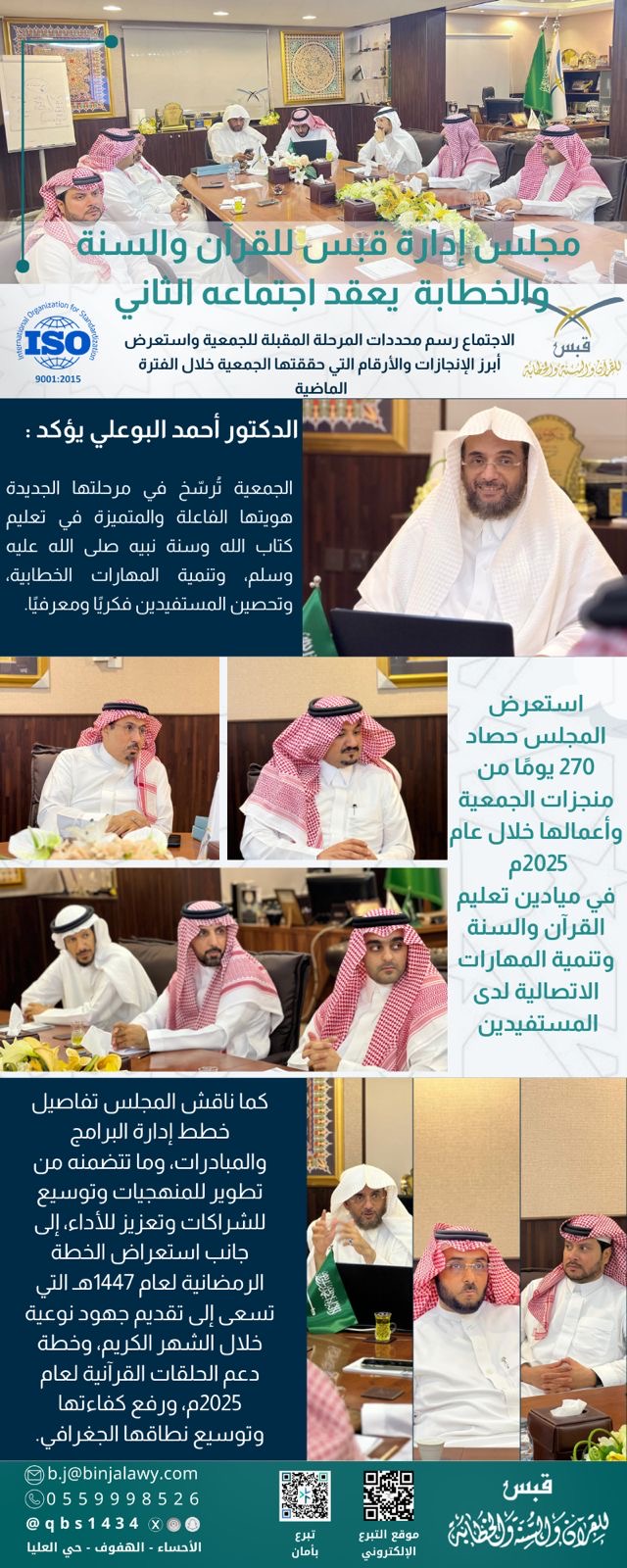 عقد مجلس إدارة جمعية قبس للقرآن والسنة والخطابة اجتماعه الثاني في دورته الثانية، مساء الأمس، برئاسة فضيلة الدكتور أحمد بن حمد البوعلي، وبحضور عدد من أعضاء مجلس الإدارة والإدارة التنفيذية بالجمعية.