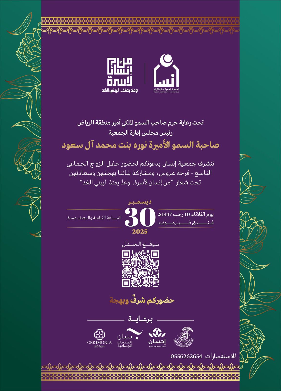 رعت صاحبة السمو الأميرة نورة بنت محمد آل سعود، حرم صاحب السمو الملكي الأمير فيصل بن بندر بن عبدالعزيز أمير منطقة الرياض، ورئيس مجلس إدارة الجمعية الخيرية لرعاية الأيتام (إنسان)، حفل زفاف 167 عروسًا في نسخته التاسعة، والذي جاء تحت عنوان