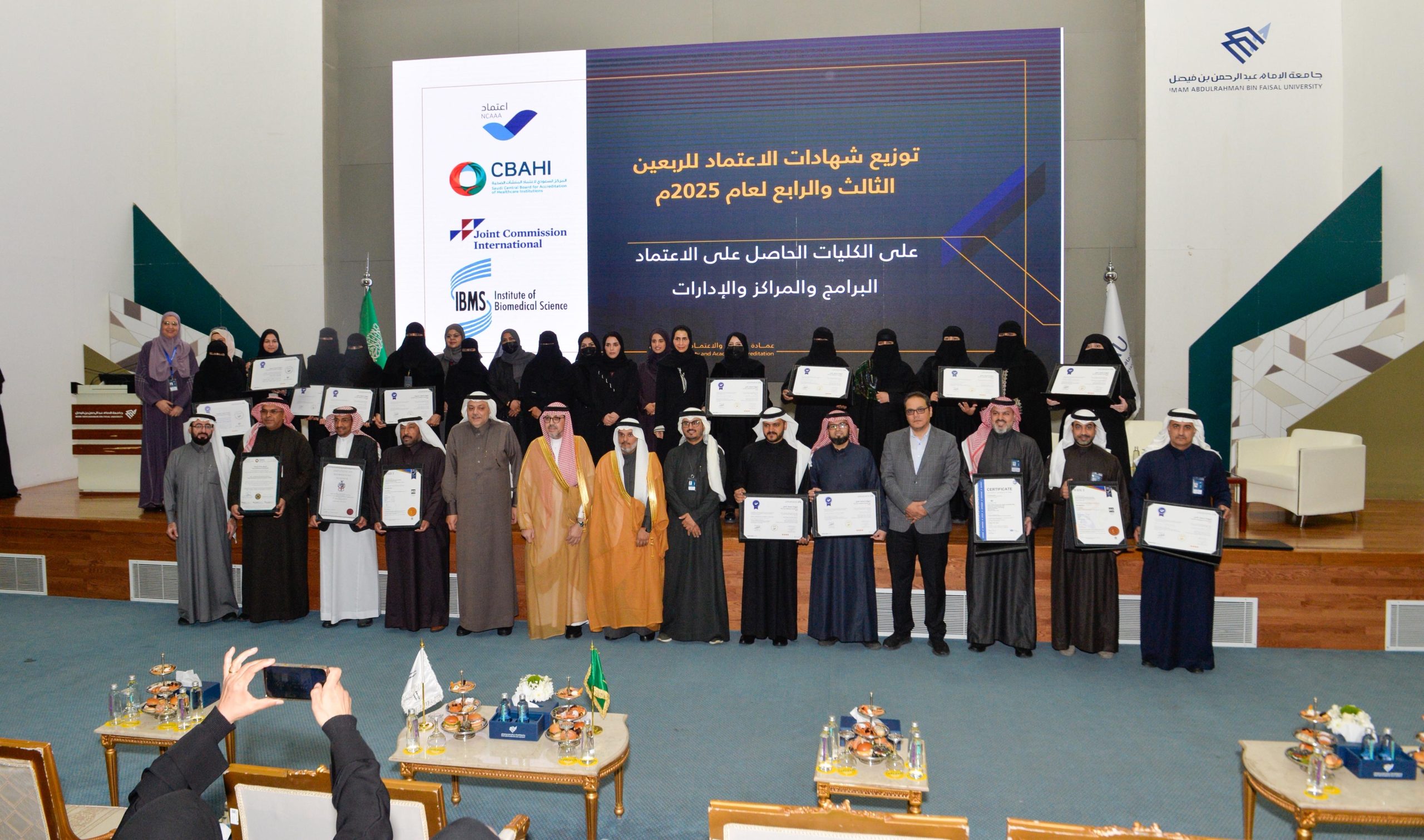 برعاية سعادة رئيس جامعة الإمام عبدالرحمن بن فيصل الأستاذ الدكتور فهد بن أحمد الحربي سلّم نائب الرئيس للتطوير والشراكة المجتمعية الأستاذ الدكتور عاصم بن عبدالرحمن الانصاري شهادات الاعتماد للبرامج والمراكز والإدارات بحضور المدير التنفيذي للمدينة الطبية الدكتور سعد العمري و بمشاركة الدكتور ناصر السرحان مستشار ضمان الجودة والاعتماد الاكاديمي وحضور عميد عمادة الجودة والاعتماد الاكاديمي بالجامعة الأستاذ الدكتور أحمد بن عبد الله الكويتي وحضور عمداء الكليات والمراكز الإدارات الذين حققوا الاعتماد و جاء ذلك ضمن فعاليات واعمال ملتقى غلق دائرة الجودة في البرامج الأكاديمية التي تنظمه عمادة الجودة والاعتماد الأكاديمي بالجامعة.