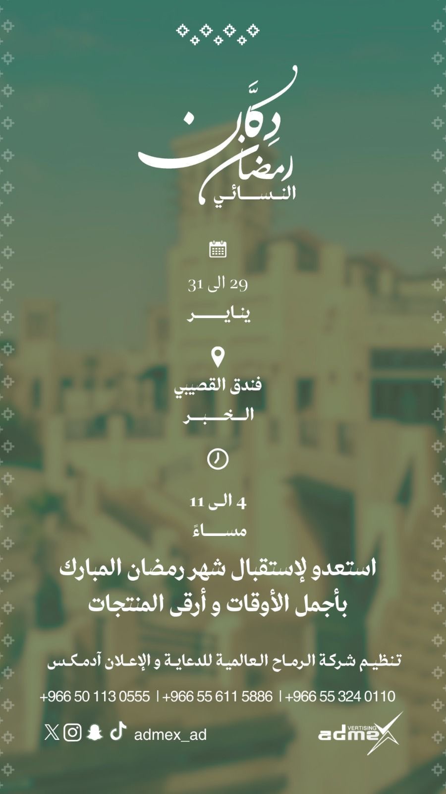 تستعد شركة أدامكس لإطلاق النسخة الرابعة من معرض “دكان” رمضان النسائي والذي سيقام لمده ثلاث أيام من تاريخ 29 إلى 31يناير في فندق القصيبي بالخبر.
