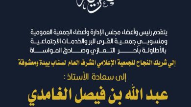 رئيس وأعضاء جمعية القرى للبر والخدمات الاجتماعية بالأطاولة يقدمون التعازي للإعلامي عبد اللّٰه الغامدي في وفاة المغفور له بإذن الله ” عمه “
