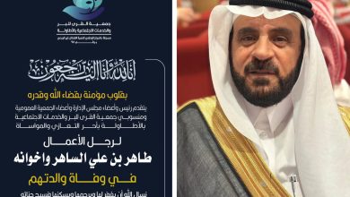 رئيس وأعضاء مجلس جمعية القرى للبر والخدمات الاجتماعية بالأطاولة يقدمون التعازي والمواساة لرجل الأعمال طاهر الساهر وأشقائه في وفاة ” والدتهم “